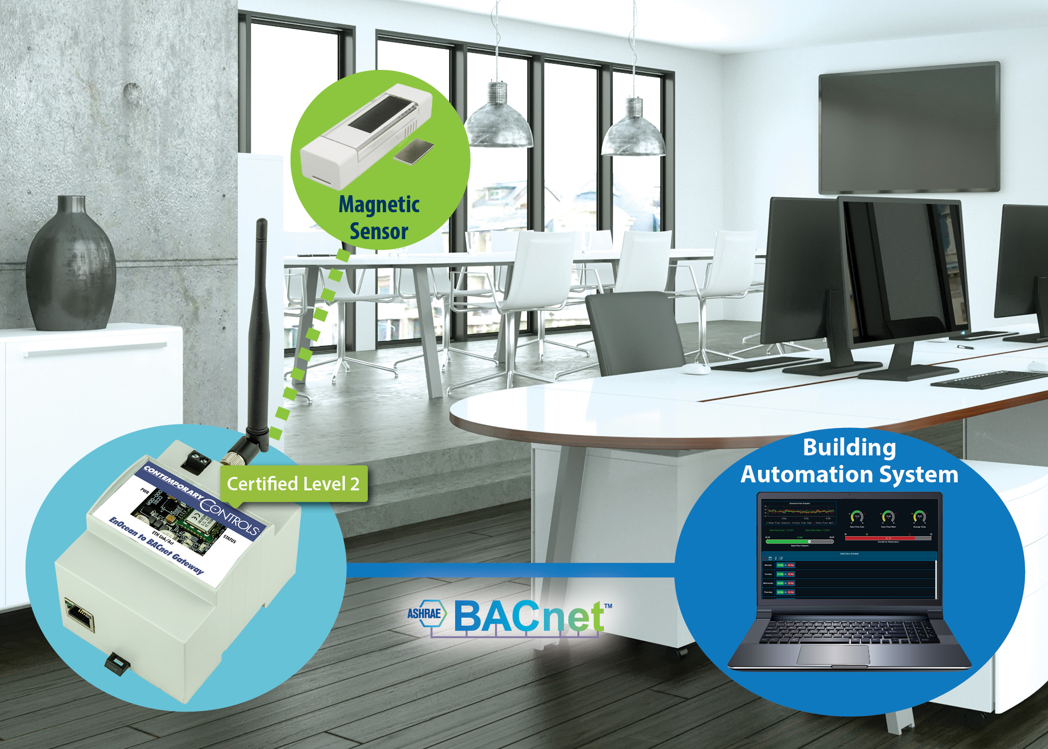 An EnOcean to BACnet gateway is the critical link that allows building automation supervisors to discover and integrate EnOcean devices into existing BACnet systems. Contemporary Controls' EnOcean to BACnet gateways provide bidirectional communication between EnOcean wireless devices and BACnet/IP networks. By incorporating virtual routing technology, our gateways allow building automation supervisors to seamlessly discover EnOcean devices via BACnet because each device will appear as a separate BACnet-compliant device. The gateway creates a set of BACnet objects, specific for each EnOcean Equipment Profile (EEP), and decodes the received EnOcean data into standard BACnet objects for integration to BACnet system.