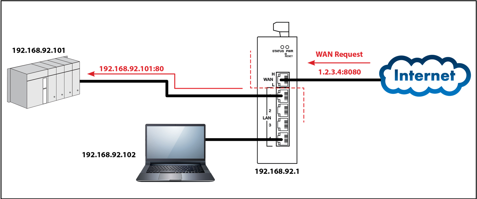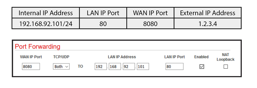 When this match is made, the message is forwarded to the indicated IP address on the LAN side. This is very useful when only one public IP address is available but there is a need to access multiple LAN-side devices. In this example, we want to access a private web server at 192.168.92.101, which is normally not visible from the Internet. Using port forwarding, a WAN-side request can be made to the router's public (WAN) address. For additional security, the port numbers have been translated. Port Range Forwarding can also be selected to allow a range of addresses to pass through the firewall.