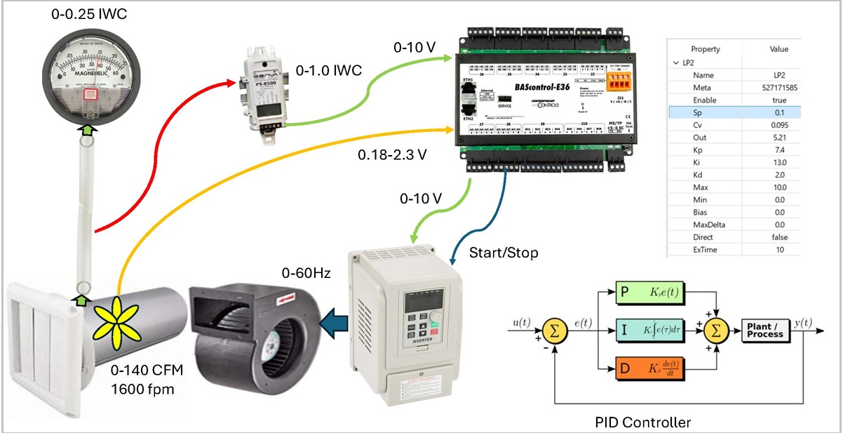 He decided to use the BAScontrol-E36 to build a demonstration unit to simulate a variable pressure system using a (Proportional/Integral/Derivative) PID control loop, similar to those commonly used in air handling units (AHUs) that feed variable volume units (VAVs).