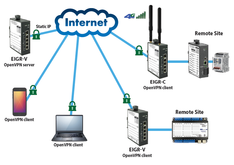 EIGR-V routers can be configured to operate in OpenVPN server mode, thereby eliminating the cloud service and related fees. Setting up an OpenVPN server on your own is not trivial, as it involves setting up a root certificate authority and generating certificates and keys for the server and each client device. However, the EIGR-V's built-in webpages facilitate the tasks without requiring downloaded software to generate certificates or keys. One EIGR-V set to OpenVPN server mode and assigned a fixed public IP address resides at the client site or any convenient site and uses the Internet for communicating to OpenVPN clients without any cloud service involved.