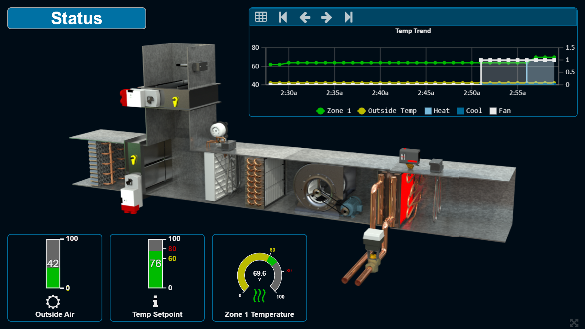 Another graphic example to accomplish equipment monitoring would be to upload an equipment image such as an RTU (Roof Top Unit), AHU (Air Handler Unit), Boiler, or any other equipment type. BASview3 gadgets can be positioned in the appropriate locations around the equipment image to indicate important parameters. The equipment image shown below was purchased from ControlPix and uploaded to the BASview3. The ControlPix image features a detailed equipment-specific depiction with animations on active elements dynamically driven by changes in point values such as an active/inactive supply fan, neutral/red heating element, neutral/blue cooling element, open/closed damper at various positions as well as clean/dirty filter indication. BASview3 gadgets such as a Trend Container, Arc and Bar Gauges are freely positioned adjacent to the equipment image to indicate any current and historical point values of interest.