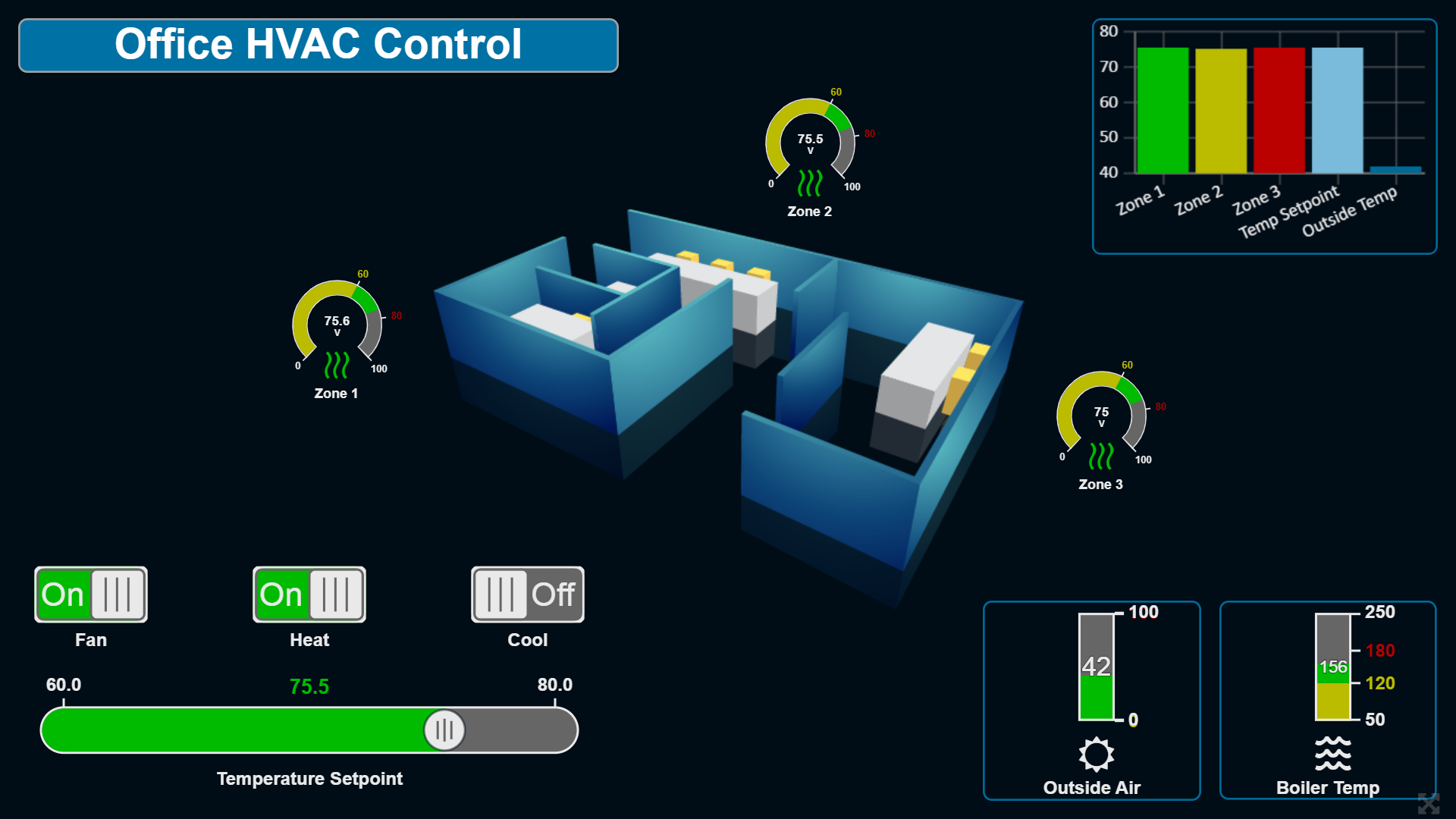 For example, the 3D floor plan image below was imported into the BASview3 as a PNG image file, then several built-in BASview3 gadgets were freely positioned on top/around it and BACnet points were attached to each gadget using the easy and intuitive menu. Graphics can be used for monitoring and/or control of any BACnet or Modbus system.