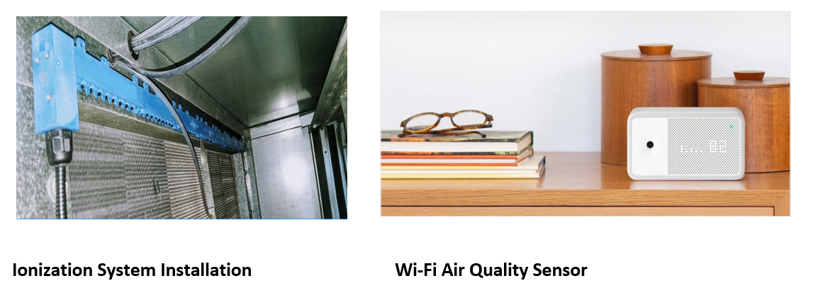 A bipolar ionization system is added to the AHU. This system creates a plasma curtain of billions of negative ions to de-activate any potential organic compounds. When high enough concentrations of negative ions come in contact with harmful pathogens such as a virus, bacteria, or mold, they steal away hydrogen molecules from the pathogens. Without hydrogen, the pathogens are left without any source of energy and they die.
