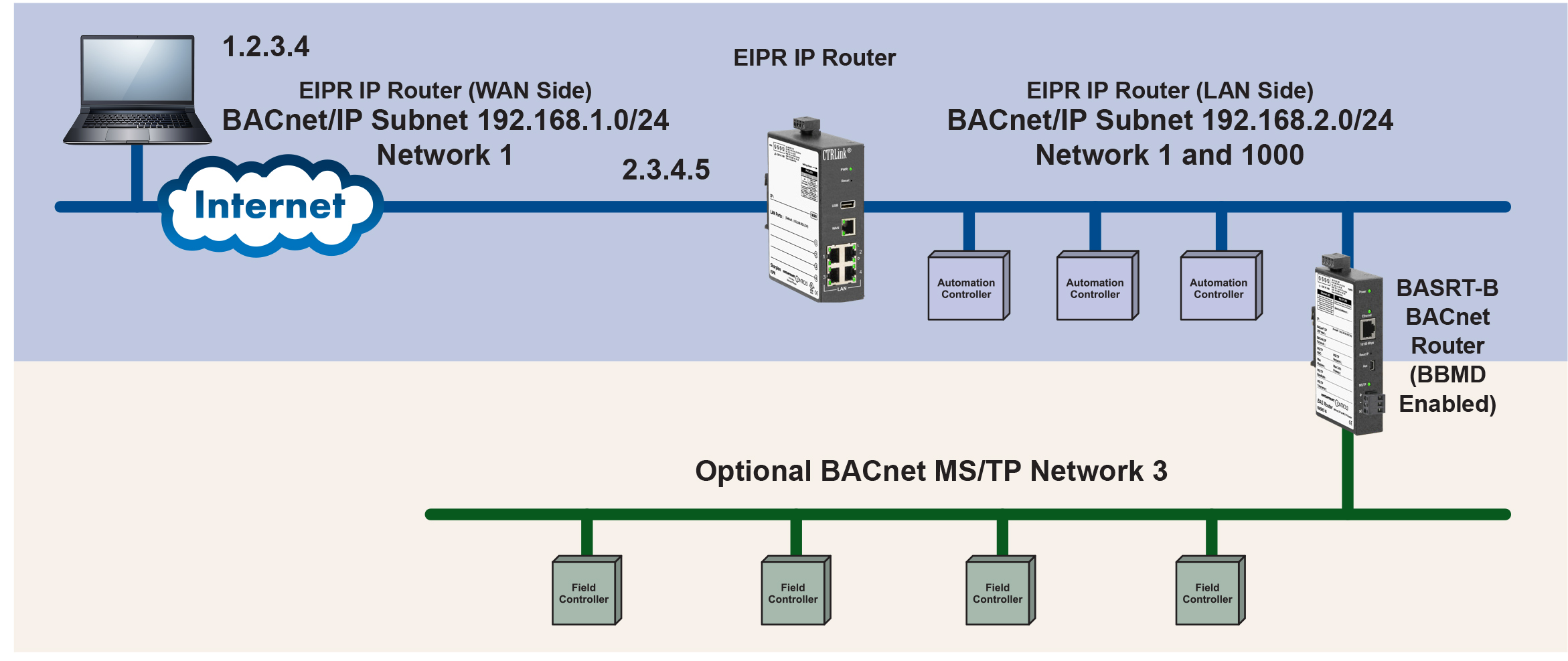 The Building Automation industry expects connectivity across a variety of BACnet networks — IP, Twisted-Pair and Ethernet. A BACnet router provides this capability with support for BACnet/IP, BACnet MS/TP and BACnet Ethernet. The ASHRAE 135 standard defines a network layer allowing multiple BACnet networks to send and receive messages over a single BACnet internetwork without concern for different data links. But a BACnet internetwork is different from multiple IP networks defined by subnets. An IP router connects these sub-netted IP networks together while two BACnet/IP networks can be interconnected using a BACnet router. The setup requires configuring both the IP router and BACnet routers appropriately. This configuration across subnets applies equally for access to remote sites across the internet.