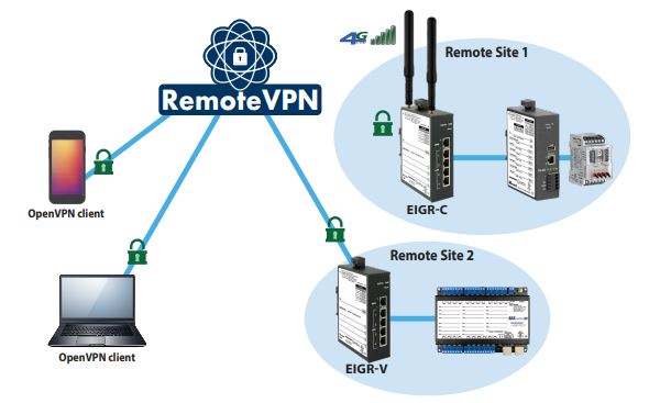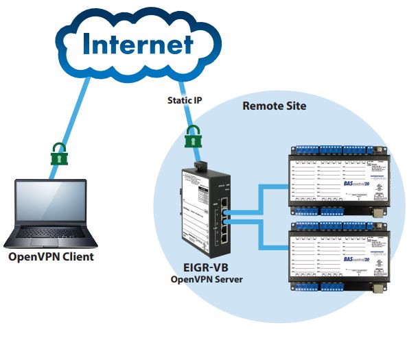 For single-site, remote access solutions, Contemporary Controls also offers a BridgeVPN solution which utilizes the EIGR-VB Gigabit IP router configured to operate in OpenVPN server mode as a wired bridge VPN server. This BridgeVPN solution can support up to 10 VPN clients on PC/tablet/phone.