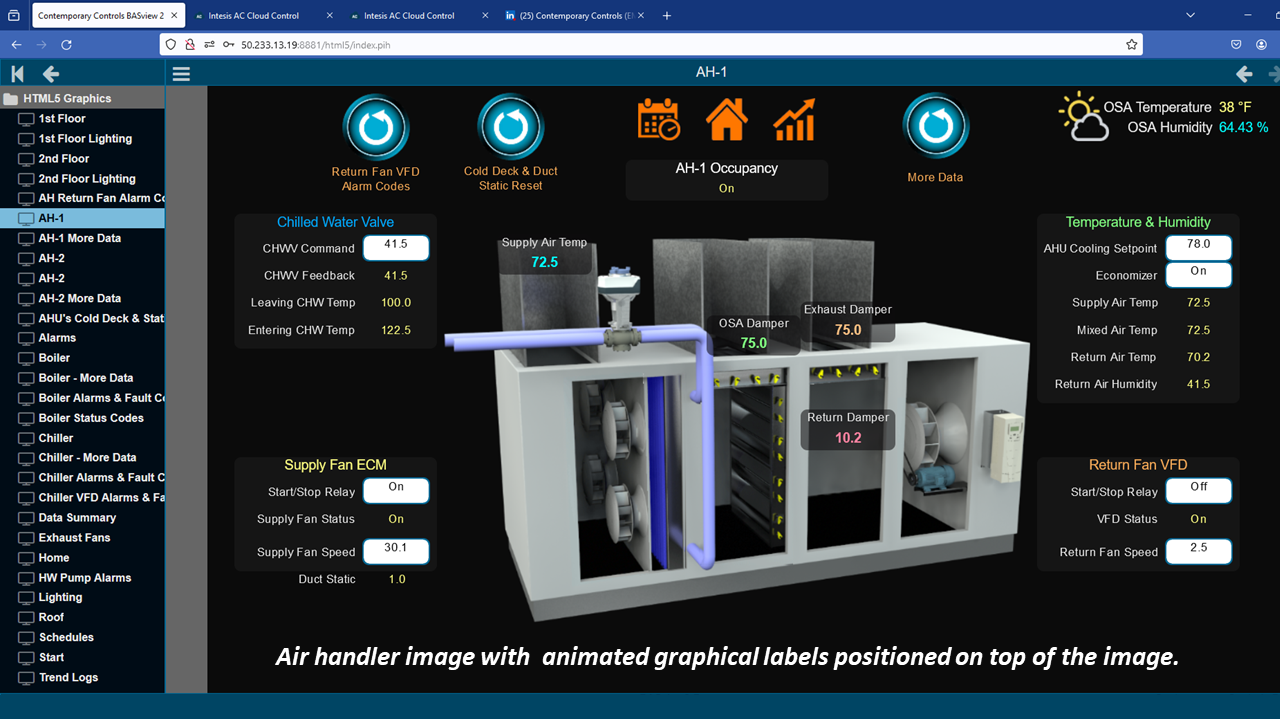 Graphics allow you to create a set of custom webpages that contain animated views of the system along with real-time point values. You can also change the operation of the building in a graphical view.