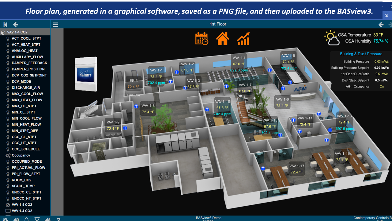 By supporting both traditional graphics and the dashboard, BASview3 can clearly display system information and simplify equipment monitoring and control. The BASview3 is ideal for small to medium buildings or processes that require a user-friendly graphical interface with no licensing requirements. The BASview3 can handle up to 2000 nodes–a combination of devices, points, schedules, alarms, trends, etc. Graphics can be purchased online from vendors, such as ControlPix.