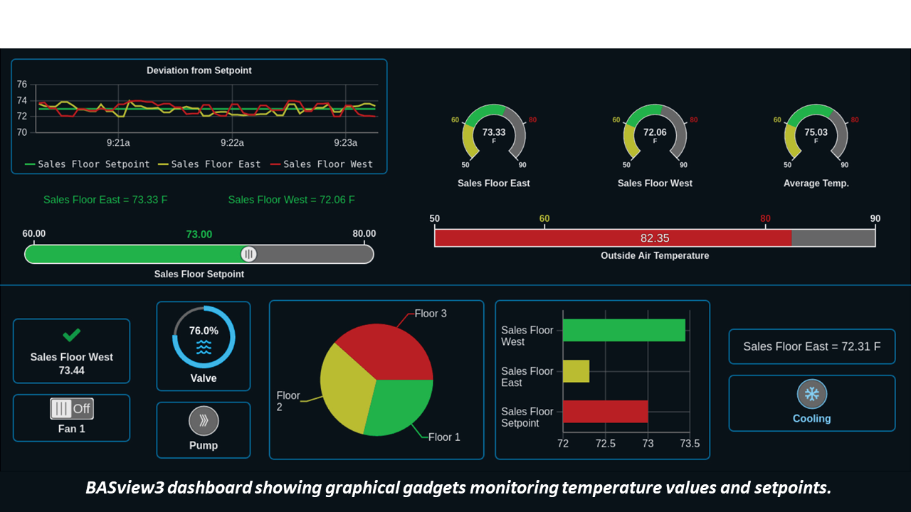 When configuring the dashboard, you cannot upload images or freely position graphical elements, instead graphical gadgets are placed in containers and positioned on the screen in the desired order. This makes dashboards scalable across devices, such as tablets, smart phones, and PCs and is ideal for monitoring and/or controlling equipment over the BACnet network. The BASview3 includes a library of built-in graphical gadgets, such as animated elements, buttons, bar charts, pie charts, strip charts, gauges, images, schedules, switches, and trends.