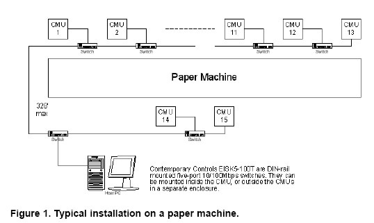 Generally speaking, the installation scenario will differ. Figure 1 is a diagram for a typical installation on a paper machine. Wier states that the length of a paper machine can be as long as a football field and as tall as a three-story structure-meaning that the overall length of the LAN can be 500 ft. or more. The switching technology of the EISK5-100T makes it easy to not only daisy-chain CMUs, but accommodates this overall LAN length with the 100 m segment restriction of 10BASE-T.