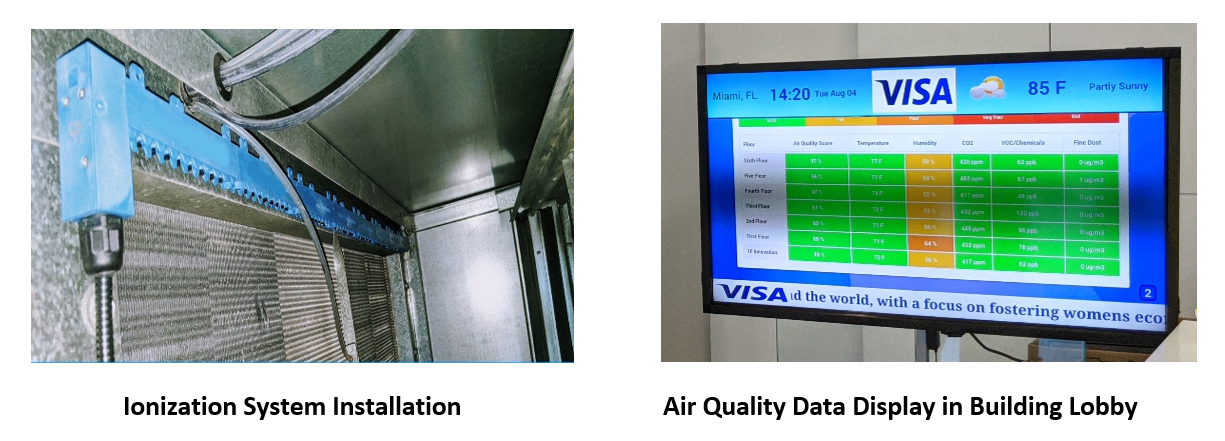 A bipolar ionization system is added to the AHU. This system creates a plasma curtain of billions of negative ions to de-activate any potential organic compounds, thus minimizing the possible unwanted VOC sharing with airborne virus and bacteria. When high enough concentrations of negative ions come in contact with harmful pathogens such as a virus, bacteria, or mold, they steal away hydrogen molecules from the pathogens. Without hydrogen, the pathogens are left without any source of energy and they die.