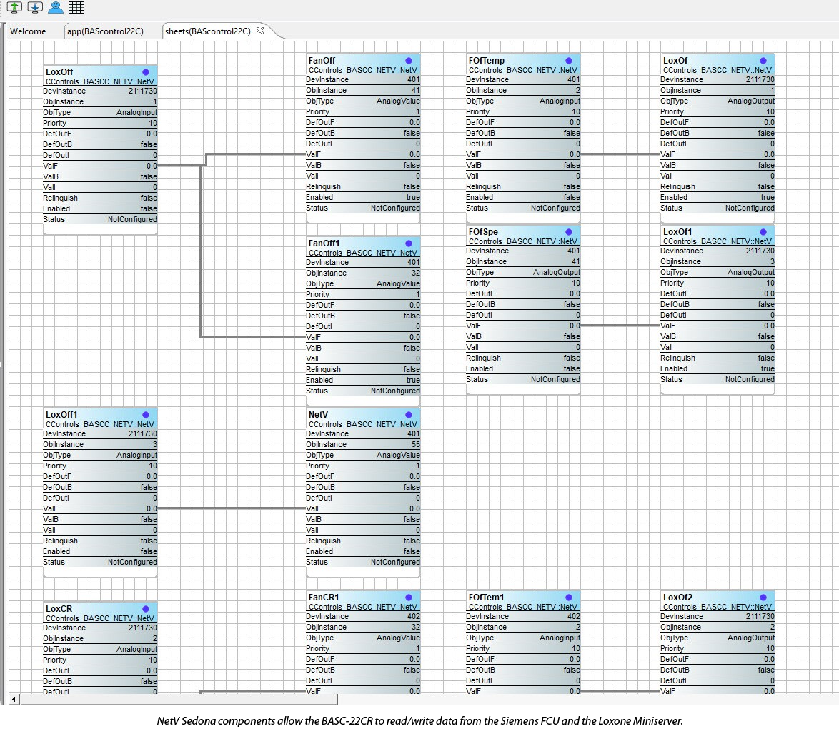 "The unit was also programmed with a self-learning program, so it calculates if it's more cost effective to increase the fan speed or flow temperature, and it extracts data to monitor system performance," said Meek. "The problem we had was with the integration between the automation control unit and the FCU that operates using BACnet." The FCU delivered the points list — room temperature, cooling setpoint, maximum fan speed, etc. — but these values were not visible within the Loxone configuration software.